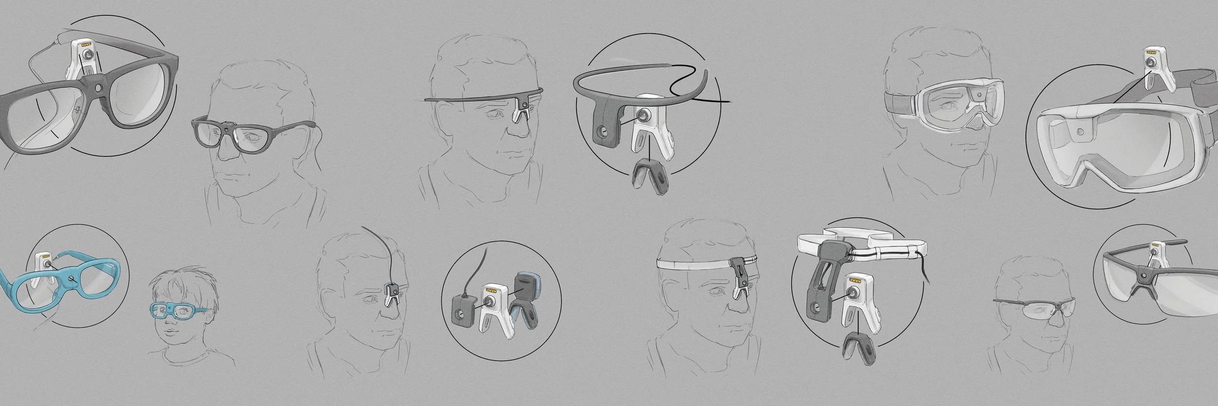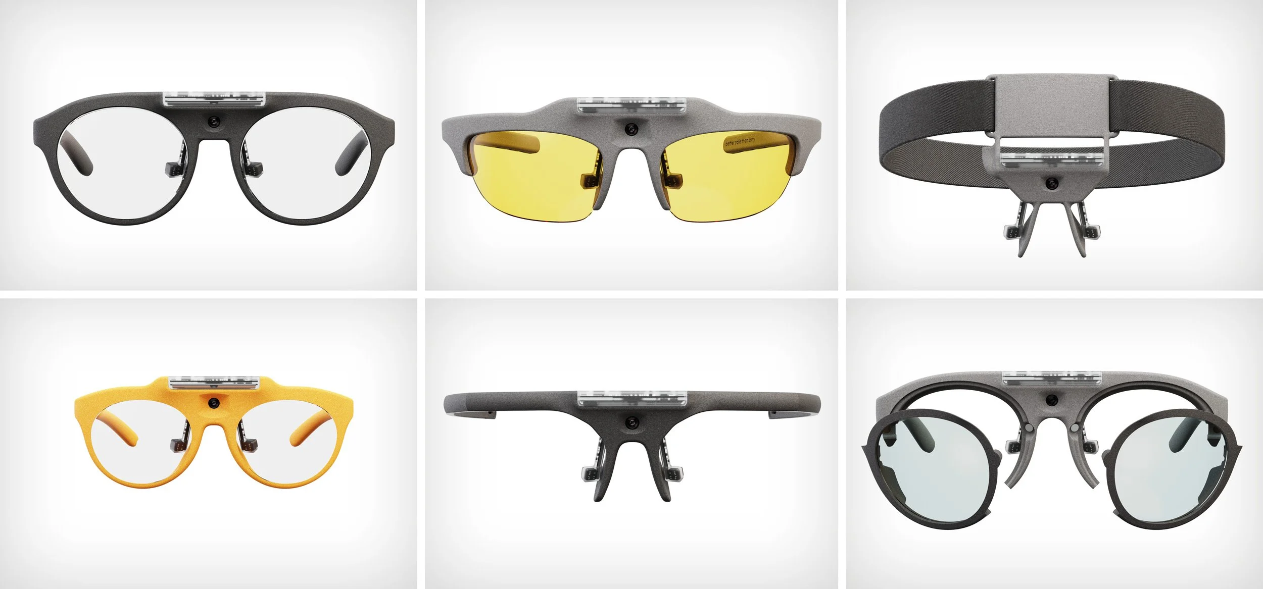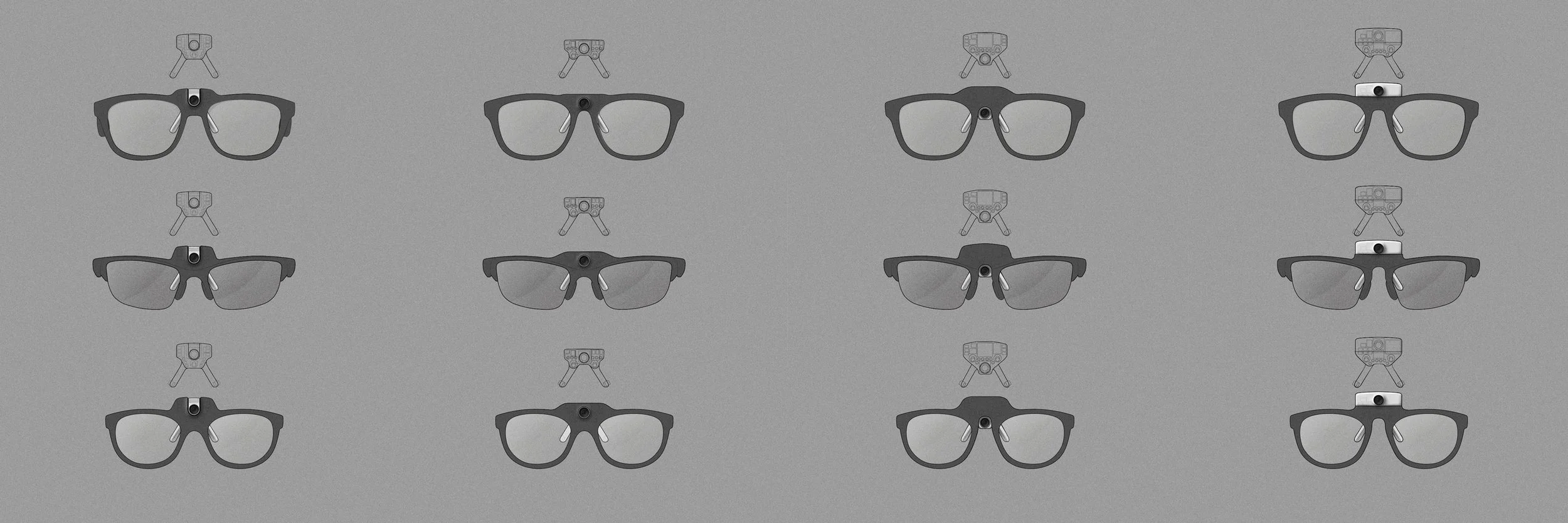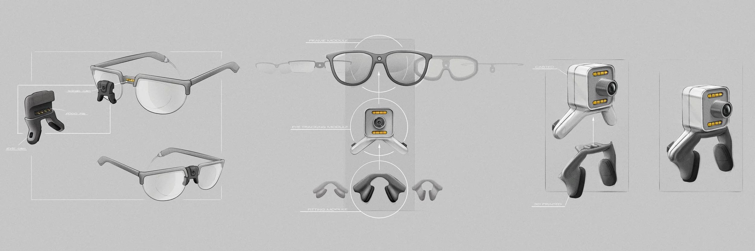 The centerpiece of NEON is the eye tracking module which packs all the necessary technical components (such as high-speed eye cameras, wide angle scene camera, stereo microphones, and IMU) in a very compact space. The module can be inserted into a range of frames, which are tailored to different application scenarios.
